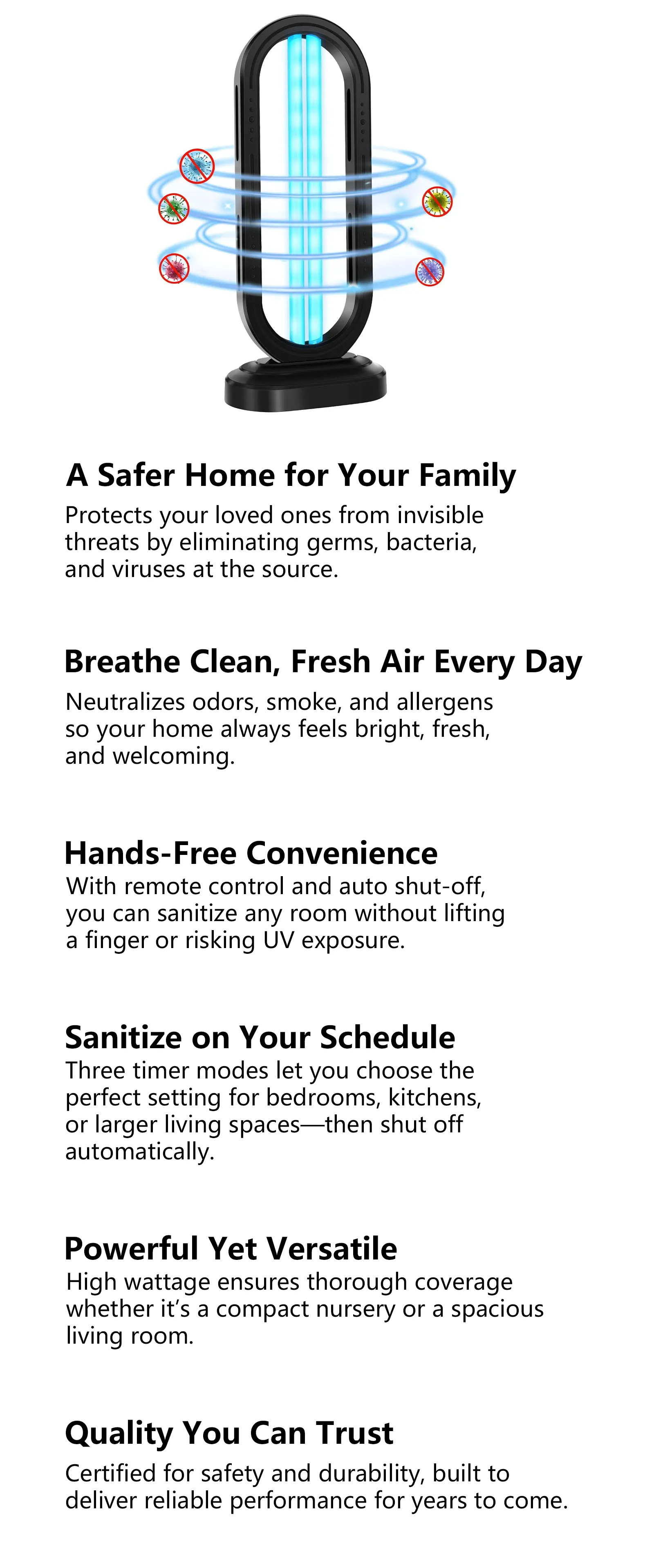 - High-Power, Wide Coverage — Strong output ensures fast, thorough sterilization, ideal for living rooms, bedrooms, and larger spaces.